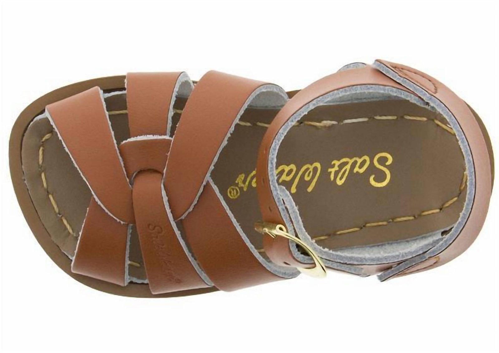 Flowy dresses, cropped pants, and even jumpsuits… this sandal works with them all!Step into timeless style with the Women’s Original Flat Sandals by Salt Water Sandals, a classic choice since circa 1944. These tan sandals feature a scuff-resistant, water-friendly genuine leather upper paired with a round toe design. Complete with a rust-proof brass buckle for a secure fit and a hand-stitched, non-slip molded rubber sole, they ensure durability and comfort. Perfect for versatile in-and-out of water wear, these shoes are easy to clean and boast a flat heel that keeps you comfortable all day.