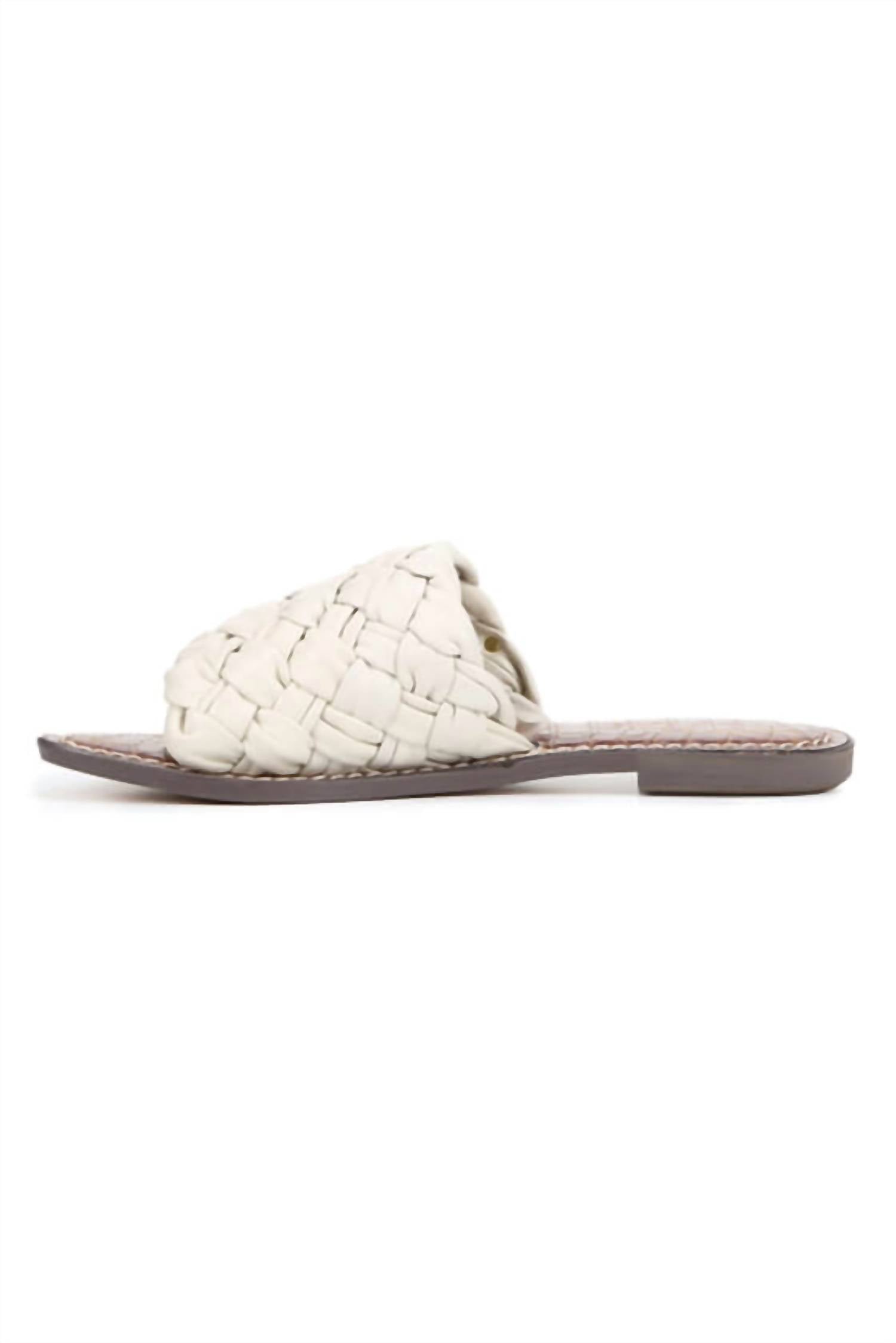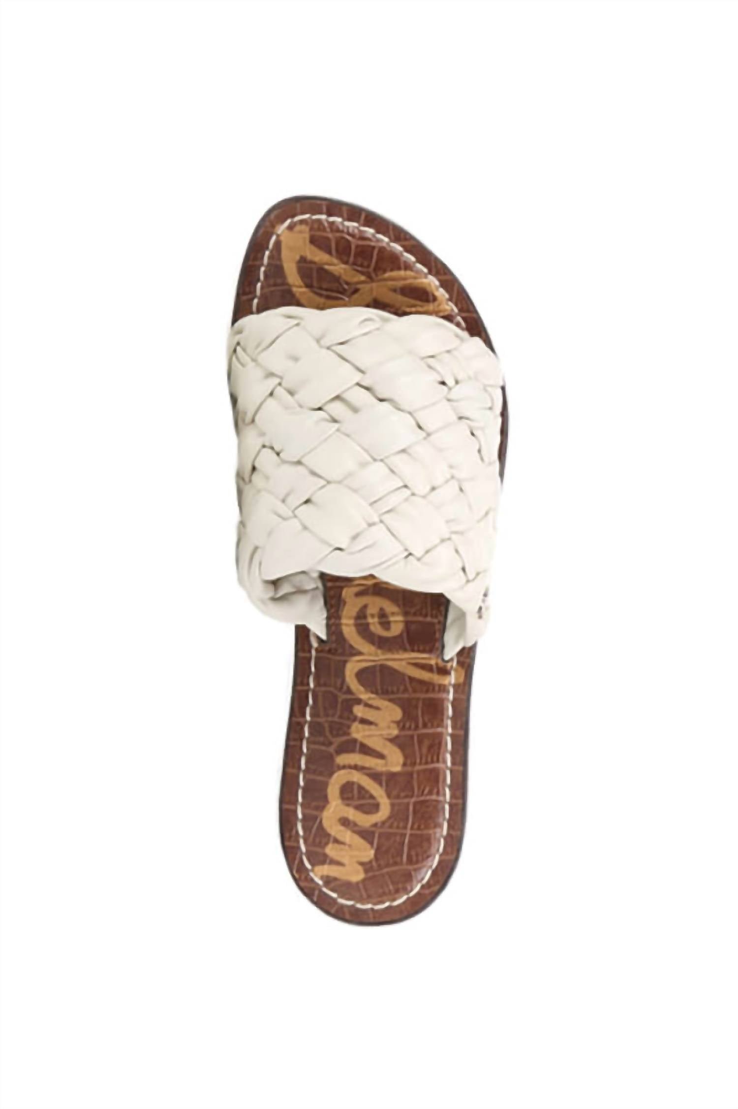 Classicly cute and all-day-wearable. We love this sandal.Discover the Griffin Woven Slide Sandal by Sam Edelman, a modern addition to your footwear collection in elegant Ivory Leather. These women’s sandals feature an open toe and slip-on closure, combined with woven leather detailing for a stylish finish. With a flat heel measuring 0.5 inches, they offer both comfort and a touch of sophistication, perfect for summer streetwear and holiday parties. The insole is crafted from synthetic material, ensuring durability and easy maintenance.