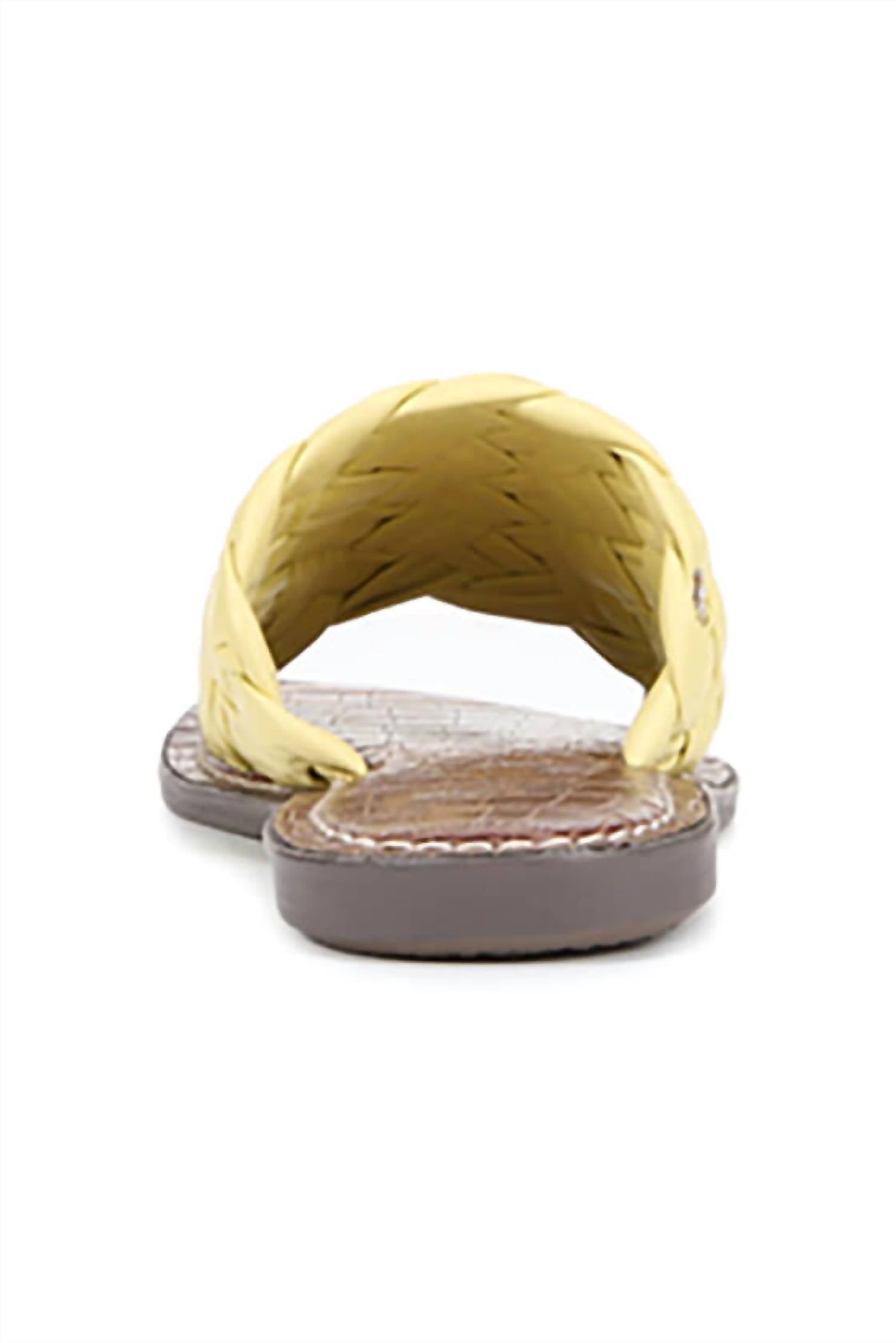 A preppy yet feminine take on the classic loafer.Step into summer elegance with the Griffin Woven Slide Sandal by Sam Edelman. Crafted from butter yellow leather, these stylish slides feature intricate woven detailing for a chic upgrade to your seasonal wardrobe. With a flat heel design and open toe, they offer comfort without sacrificing on trendsetting style. Featuring a convenient slip-on closure, these slides have a synthetic insole and a modest platform height of 0.5′ for added ease.