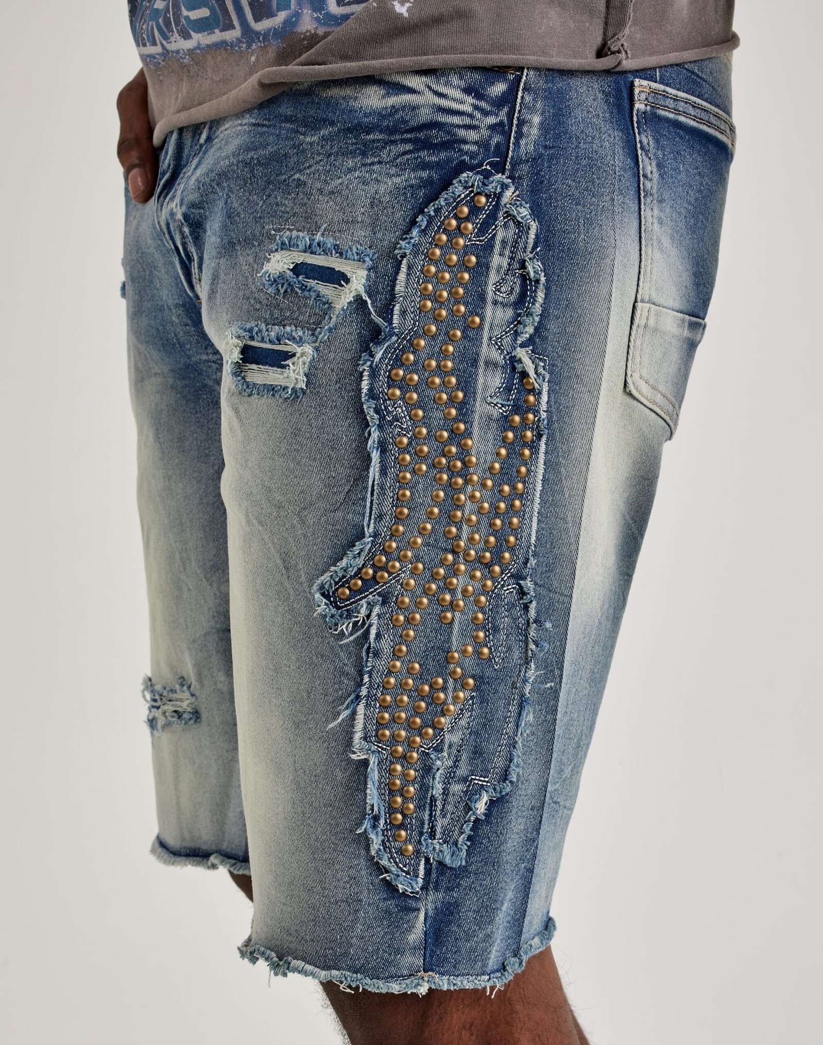Add a new look to your warm-weather wardrobe. These Studded Patch Denim Shorts from Smoke Rise feature major distressing and frayed hems for that modern streetwear feel. They’re made from a lightweight stretch-cotton blend to keep you cool in the heat.