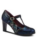 Pair these beauties with your favorite skinny jeans or dress for a night out on the town.Step out in style with the Mazie Casual Strap Heels by Spring Step Shoes, crafted in a striking Navy Multi finish. These heels feature a heel height of approximately 3 ¼ inches with a ¼-inch platform for an added lift. The design combines two-tone textured floral metallic printed leather with colorful mosaic-patterned shiny leather, complemented by a T-Bar strap and decorative brushed metal buckle. Enhanced with imitation leather lining, a comfortable padded footbed, and a sophisticated architectural heel, these shoes promise comfort without compromising on elegance.