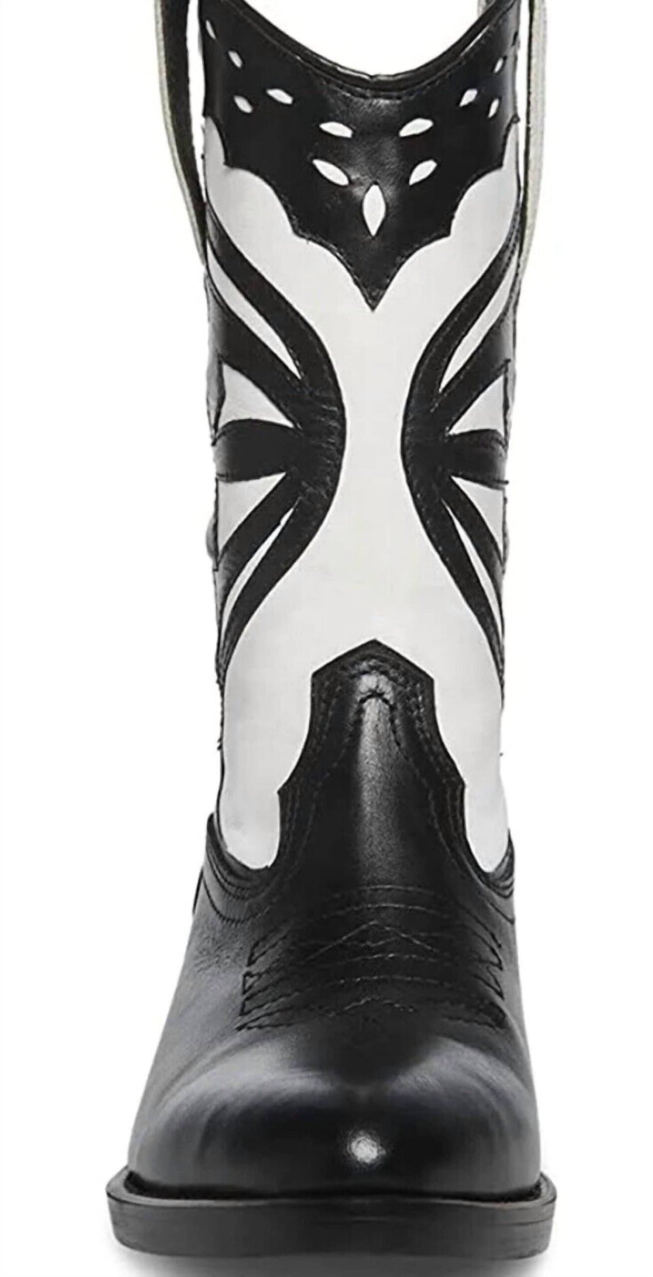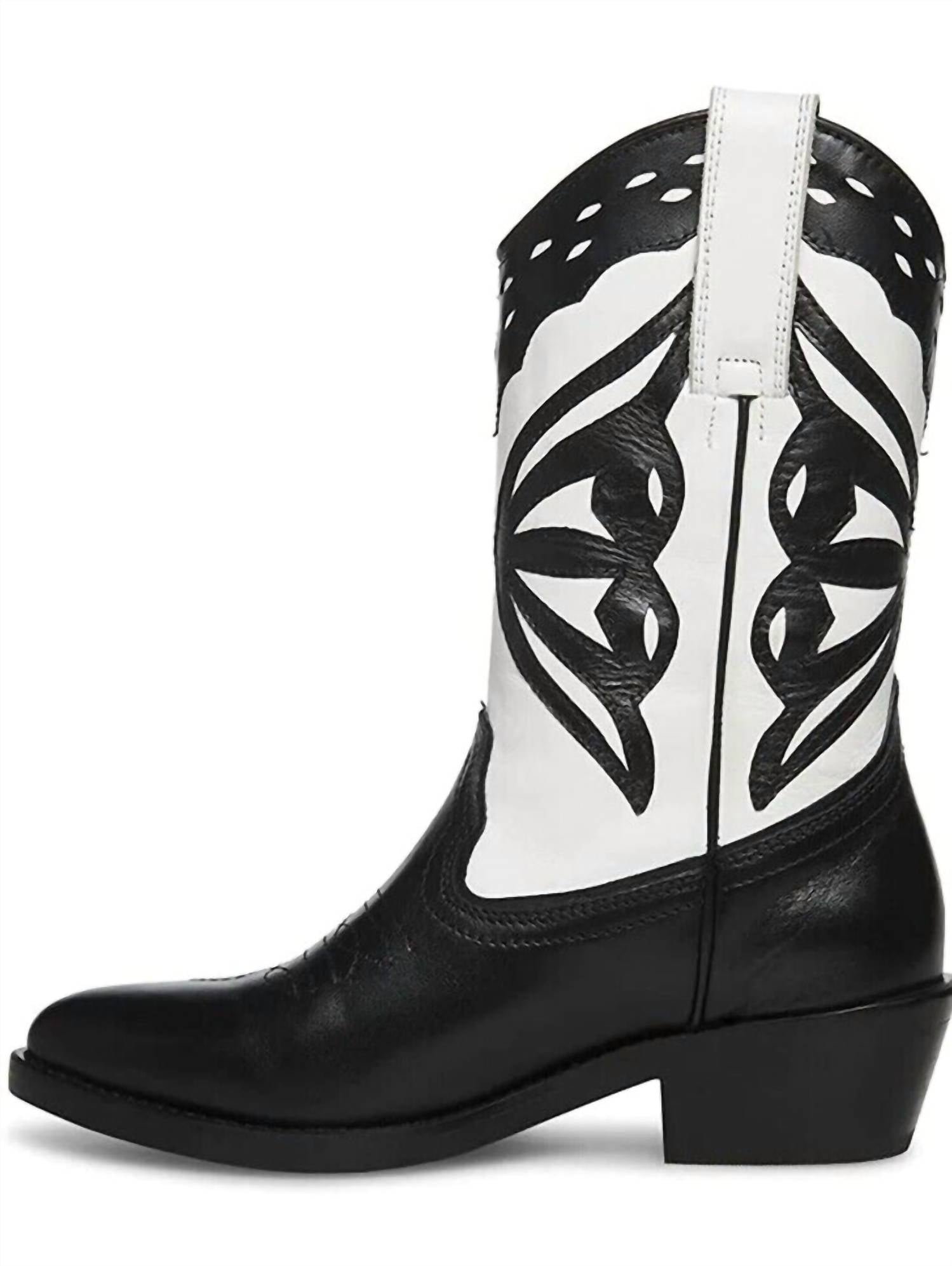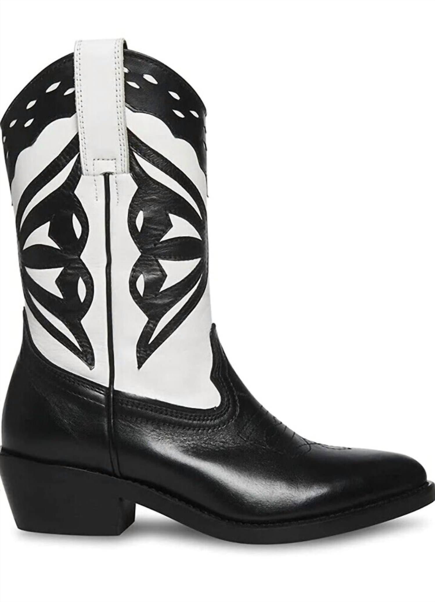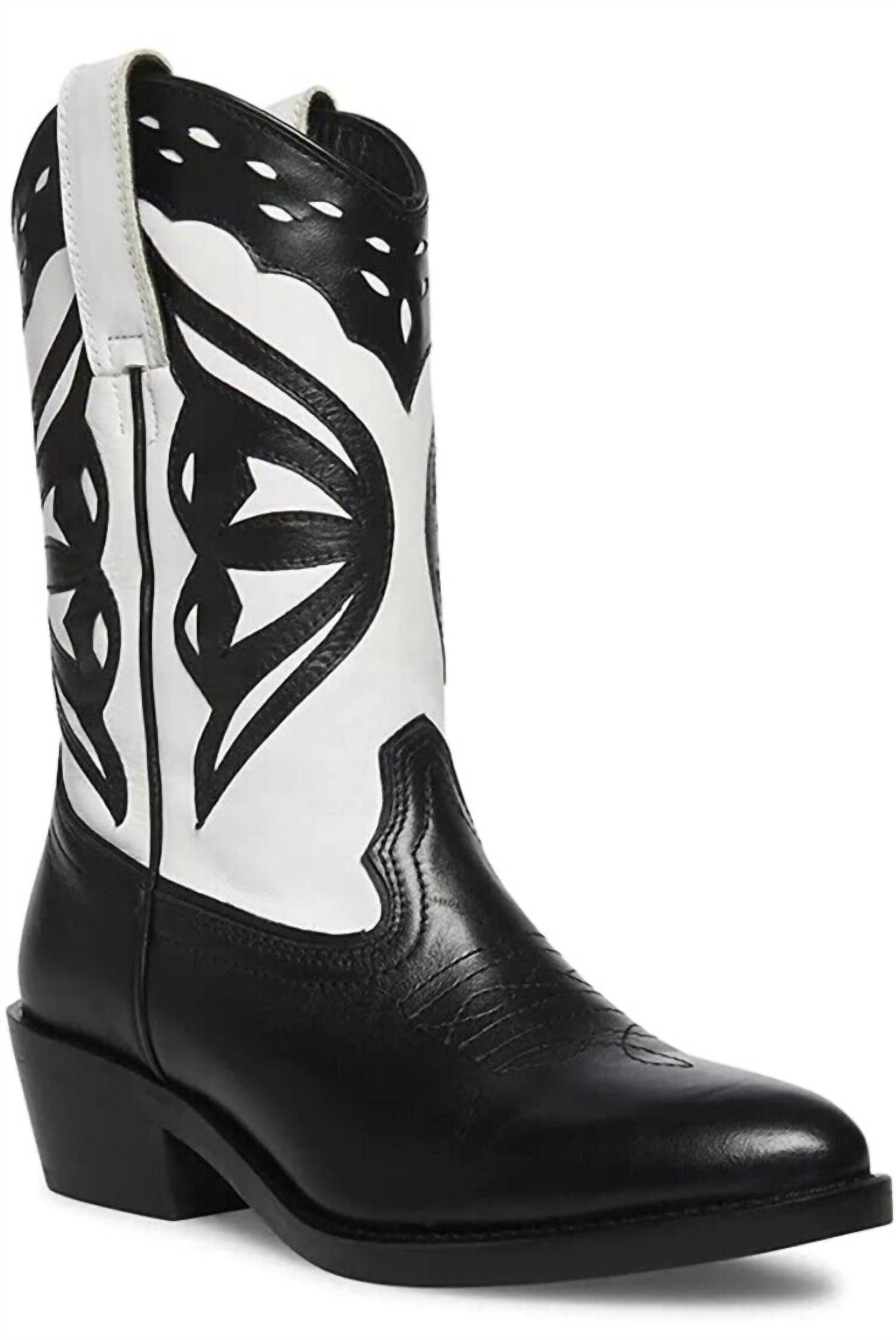Say hello to the perfect, most versatile boot. The ankle height makes this style easily transition from day to night. Wear them with your favorite skinny jeans and tee for a more laid back look, or pair them with your favorite mini dress and jacket for a night out on the town.Step into style with the Women’s Laredo-m Western Cowboy Heel Boots by Steve Madden, crafted from sleek black and white faux leather. These ankle boots feature an almond toe and a block heel, with a low 2-inch heel height that’s perfect for all-day wear. Embrace the Western trend this spring and make a statement at your next costume party, especially during Thanksgiving festivities. Available in multiple sizes, ensuring a great fit for every occasion.