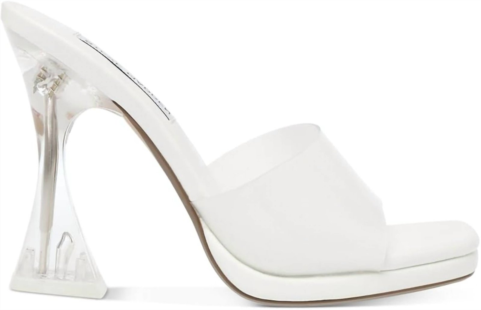 The perfect height for day to night.Statement meets sophistication with the Women’s Sculptural Statement Heel by Steve Madden. Perfect for summer anniversaries, this heel features an open toe and a striking 4.5-inch high spool heel to elevate your look. The white vinyl upper material ensures a barely-there chic appeal, while the synthetic sock and sole offer comfort for prolonged wear. Ideal for those who wish to stand out in style.
