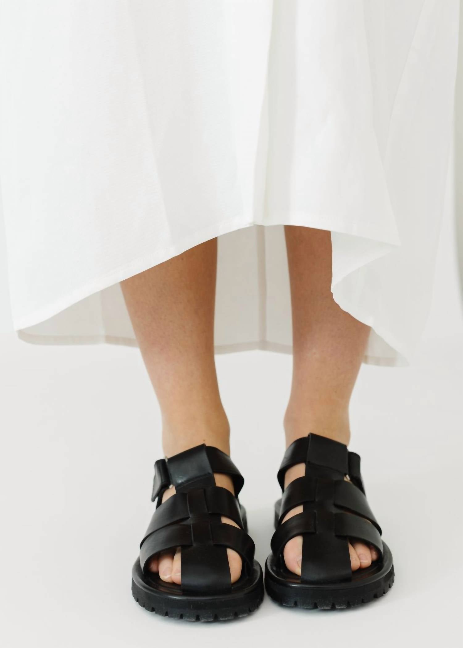 Flowy dresses, cropped pants, and even jumpsuits… this sandal works with them all!Elevate your seasonal style with the Women’s Fisherman Sandal from Studio Nicholson, designed for effortless elegance in Black. These sandals feature a leather construction and a Velcro fastening for a secure fit. Enjoy comfort with a cushioned footbed and superior traction thanks to the Vibram rubber outsole. Material: 100% Leather. Care: Remove dirt or oil marks with a clean cloth and use a neutral polish for upkeep. Perfect for vacation or summer outings, they boast a round toe and flat heel, embodying Boho Chic appeal.