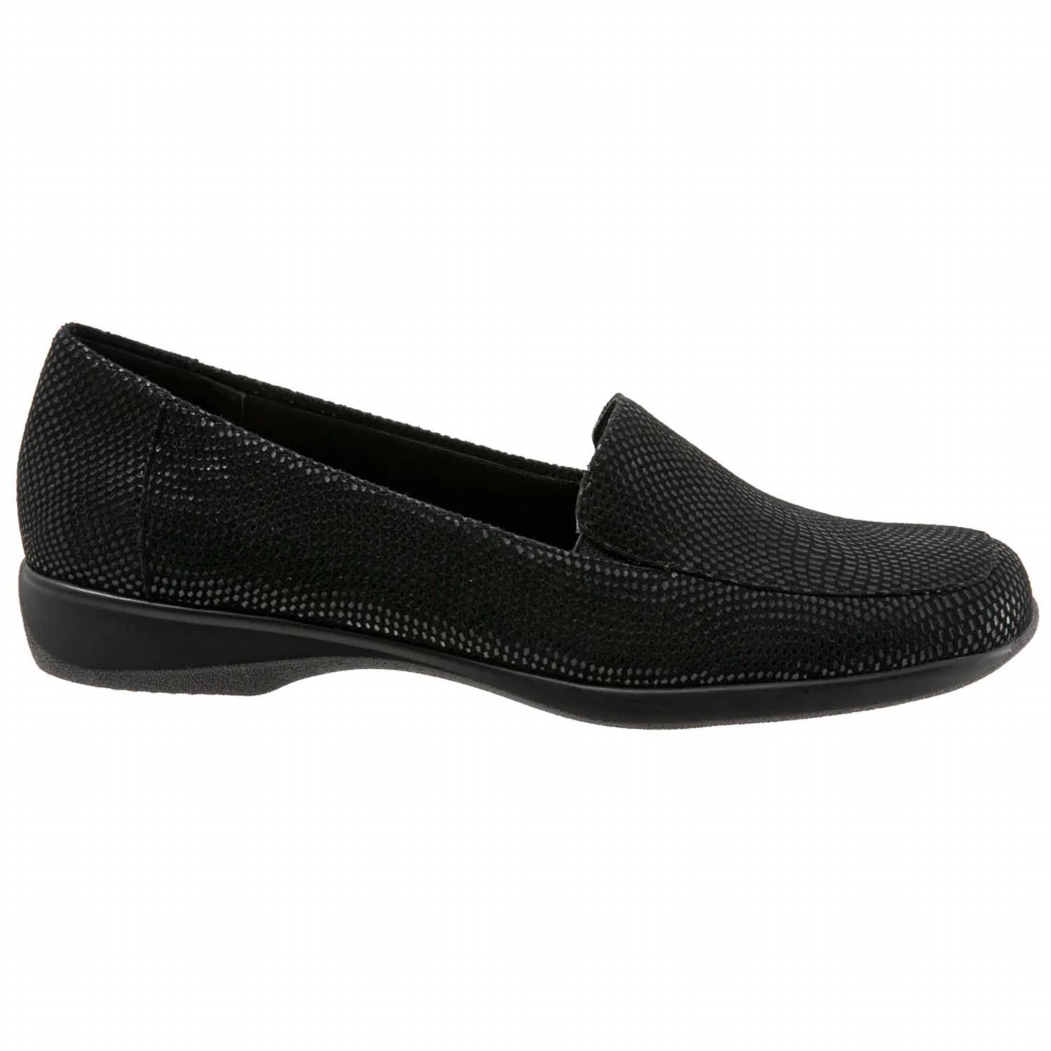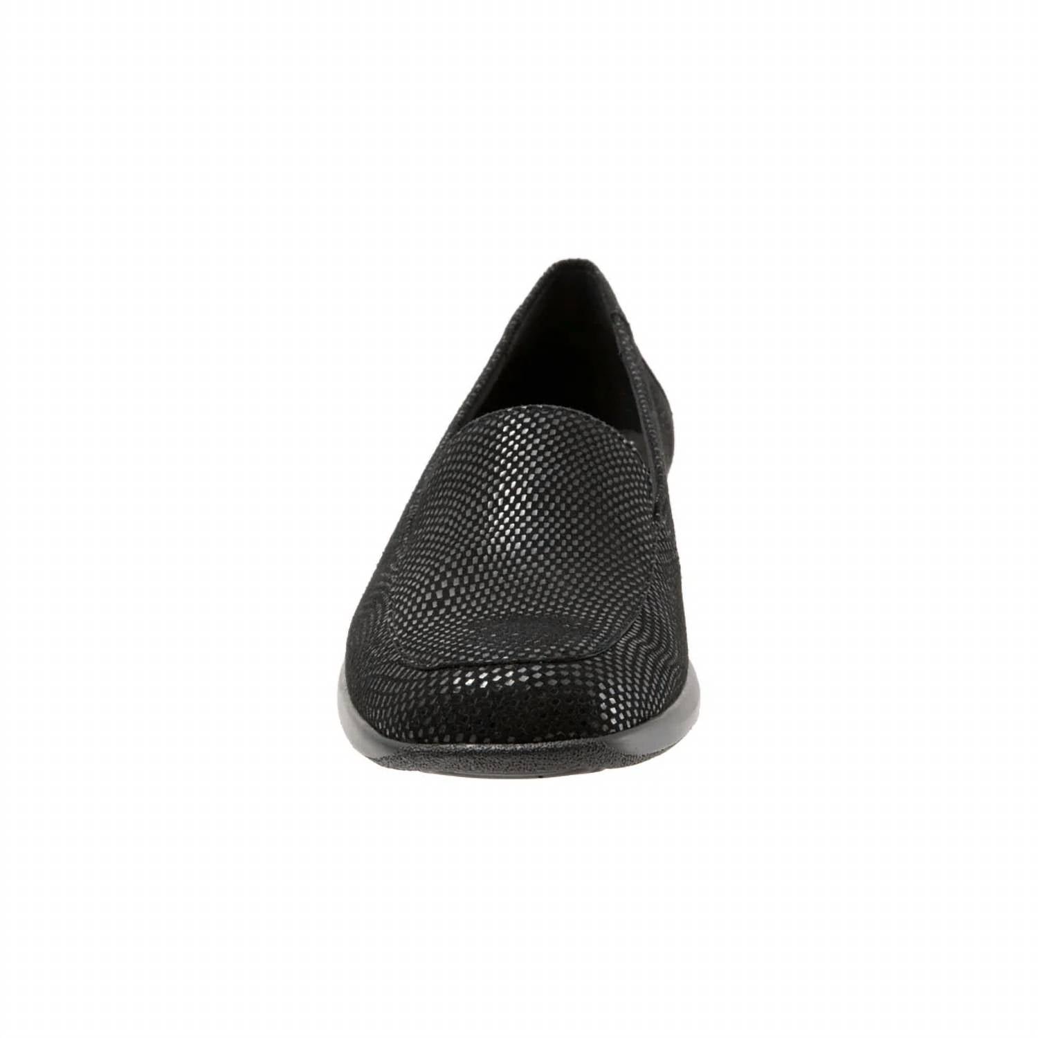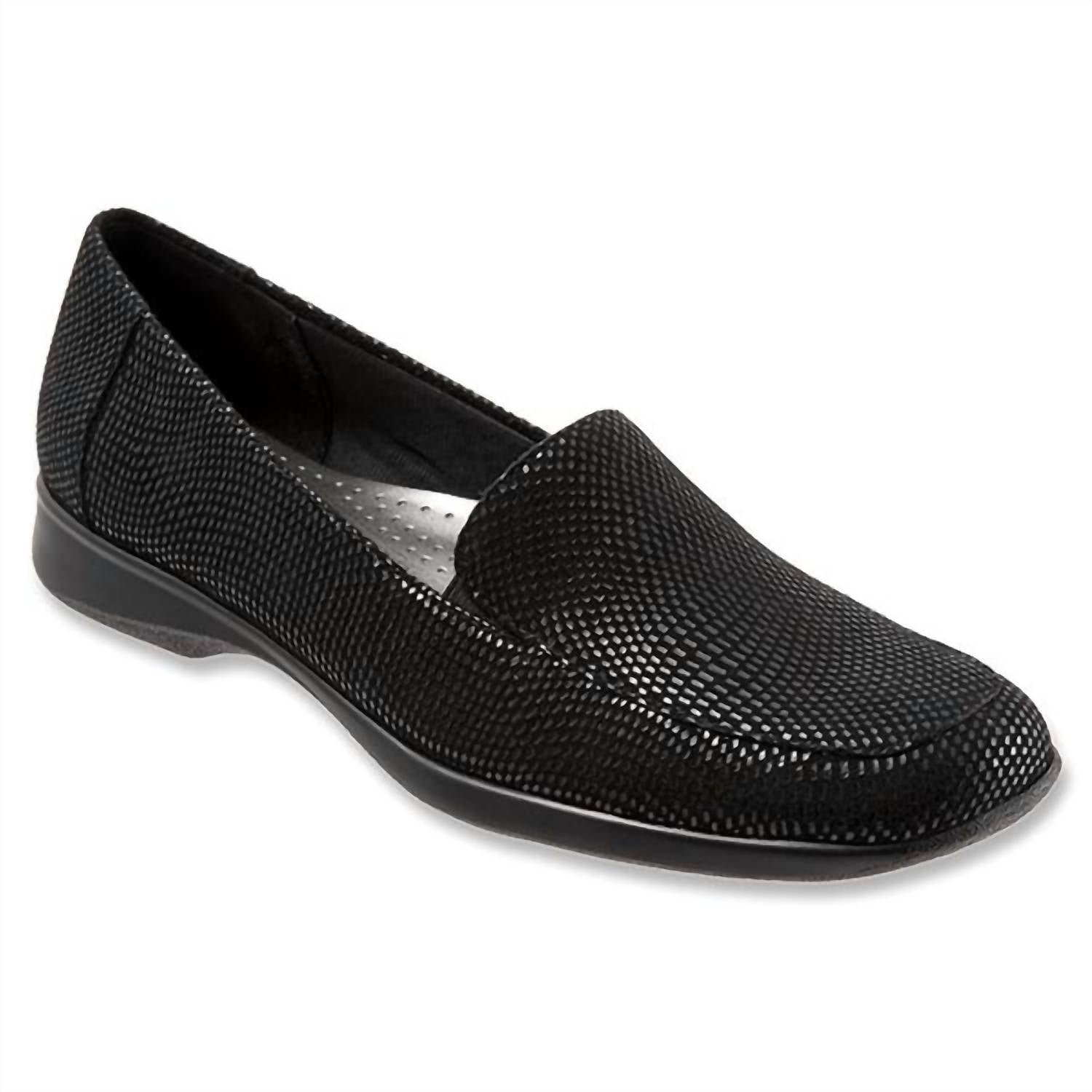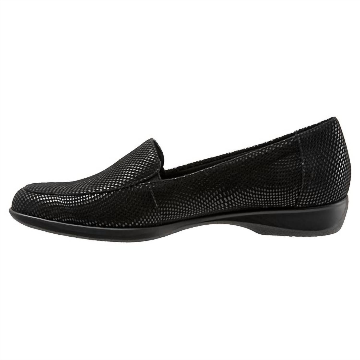Loafers so versatile you can wear them with just about anything.Introducing the Women’s Jenn Mini Dots Patent Suede Leather Shoes by Trotters, a stylish and comfortable choice for any wardrobe. Featuring a leather upper with elastic goring for a snug fit and a fabric lining for added comfort, these shoes are crafted to perfection. The perforated, contoured footbed and polyurethane sole ensure breathability and support. Heel height is 1′, and they come in a sleek squared toe design, ideal for the modern woman seeking both elegance and practicality in her footwear.