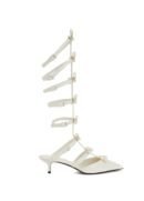 Don’t be deceived, these heels are comfy as can be.Step into elegance with the Women’s Bow Embellished Kitten Heel Pumps by Valentino Garavani, crafted in Italy. These off-white pumps are made from 100% leather both inside and out, featuring multiple straps and charming bow detailing for a sophisticated touch. Designed with a pointed toe and a kitten heel measuring 1.6 inches (low heel height), they embody a chic, feminine style perfect for the spring season.