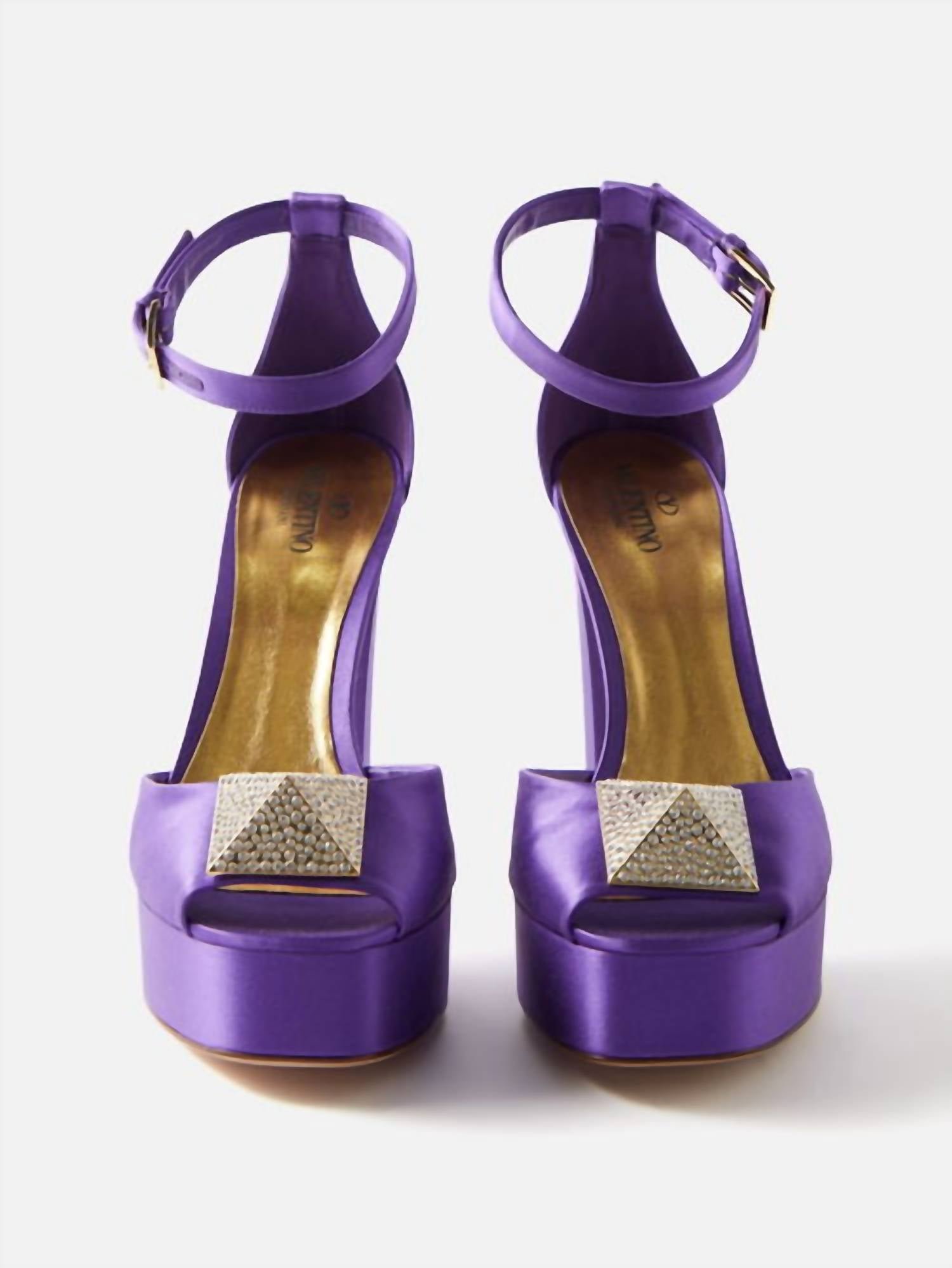 The perfect height for day to night.Step into the spotlight with Valentino Garavani’s Women’s One Stud Platform Sandals, a stunning addition to your summer wardrobe. Made in Italy, these block-heeled sandals feature a luxurious 100% silk composition in a striking purple hue. The standout design is adorned with crystal-embellished One Studs, a larger take on the brand’s iconic Rockstud motif. With a chic peep toe design, these heels effortlessly combine elegance and eccentric style.