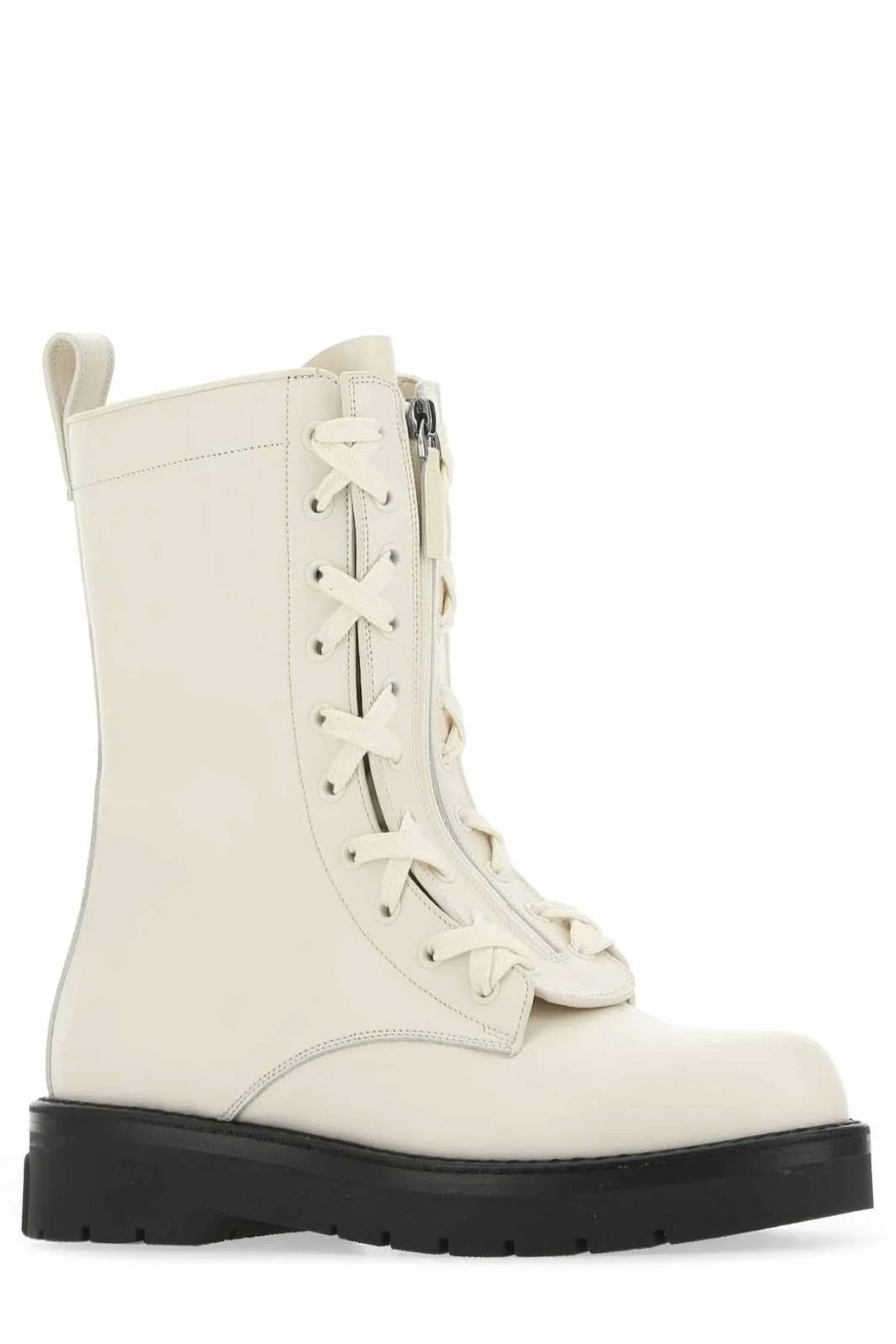The moto boot trend is here to stay and we especially love this style.Introducing the Women’s Rockstud Lace-up Combat Boots by Valentino Garavani, a luxurious addition to any wardrobe with a timeless neutral hue. Crafted in Italy, these boots feature a robust leather composition, a round toe, and signature Rockstud detailing for an edgy yet sophisticated look. The dual closure system with both lace-up and front zip fastening ensures a snug and stylish fit. Enhanced by a ridged rubber sole, these boots are ready to conquer any terrain with elegance.