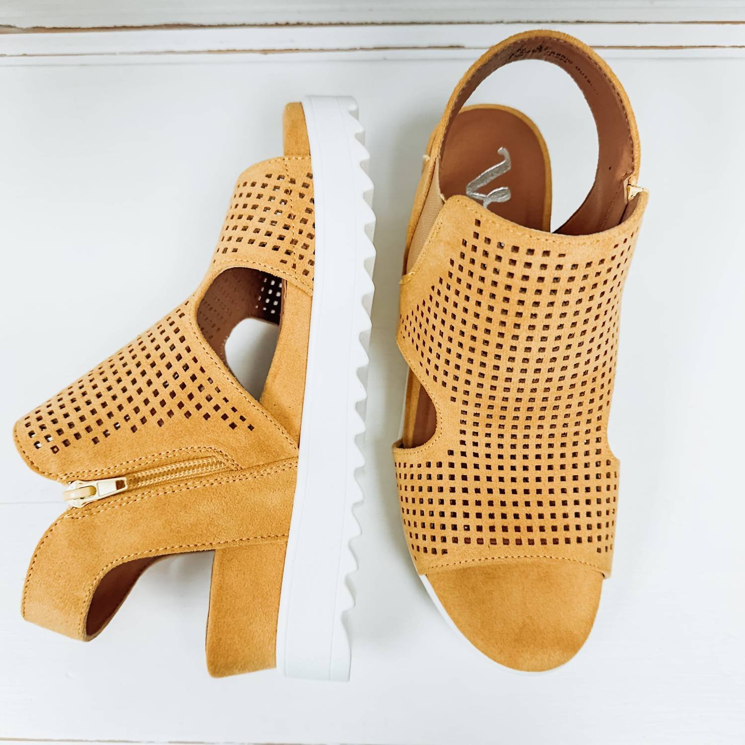 Flowy dresses, cropped pants, and even jumpsuits… this sandal works with them all!Step into effortless style with the Amy Platform Sandal by Very G, a must-have for the Spring and Summer seasons. Designed with a platform heel and round toe, this sandal provides both height and fashion-forward style. The vegan suede mesh outer and elastic goring ensure a comfortable, flexible fit throughout the day. Notably crafted with a super soft, cushy insole for ultimate comfort, these sandals are perfect for sunny adventures.
