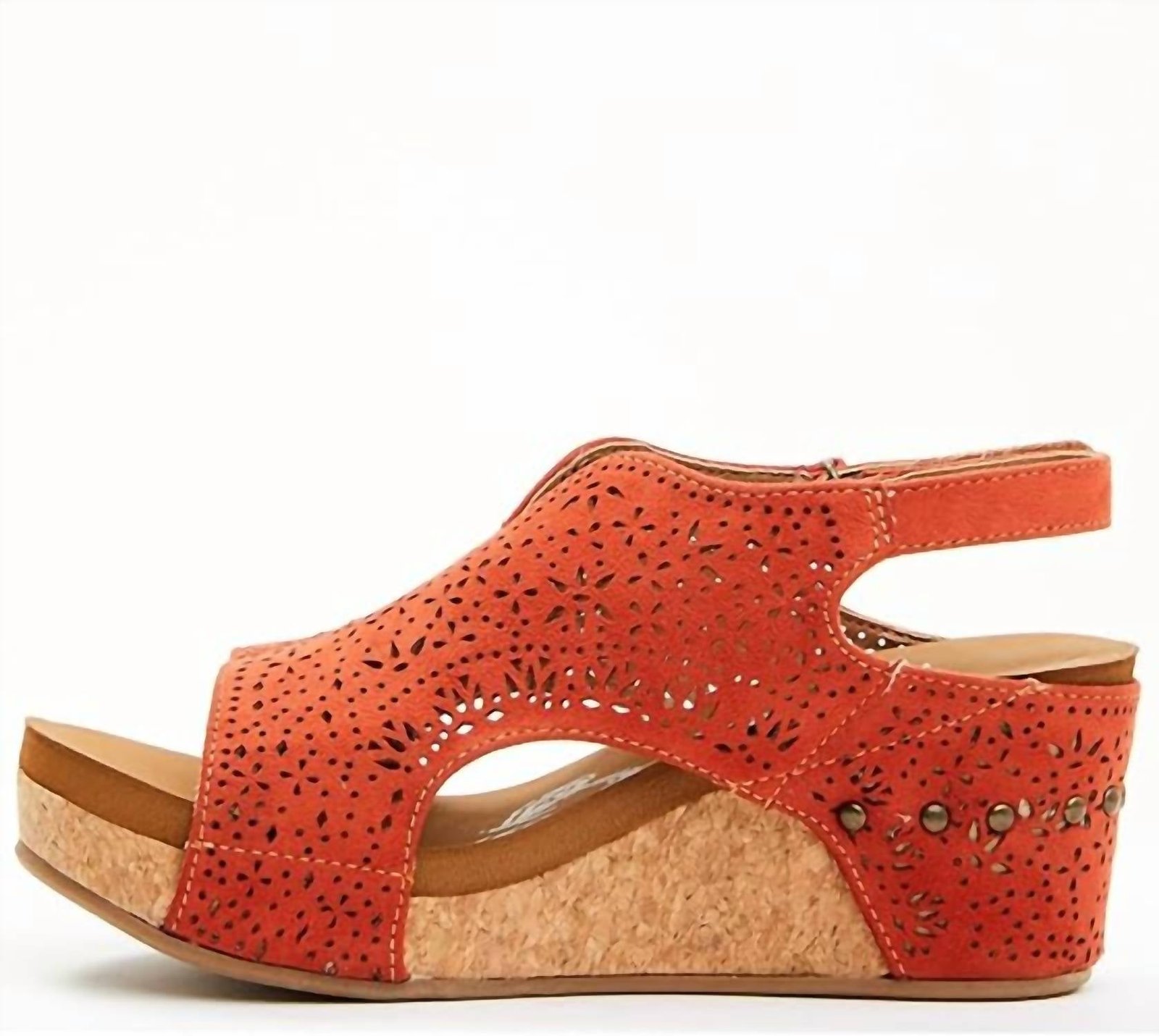 Classicly cute and all-day-wearable. We love this sandal.Step into style with the Women’s Free Fly Wedge Sandals by Very G, perfect for elevating your summer wardrobe. These rust-colored sandals feature rust suede straps and a cork wedge, ranging from 1.5′ at the front to 3′ at the back. The tribal cutout design adds a trendy touch, while the foam footbed ensures comfort for prolonged wear. Featuring vintage gold hardware and a convenient velcro closure, these sandals are an ideal choice for cocktail parties or pairing with your favorite fall outfits.