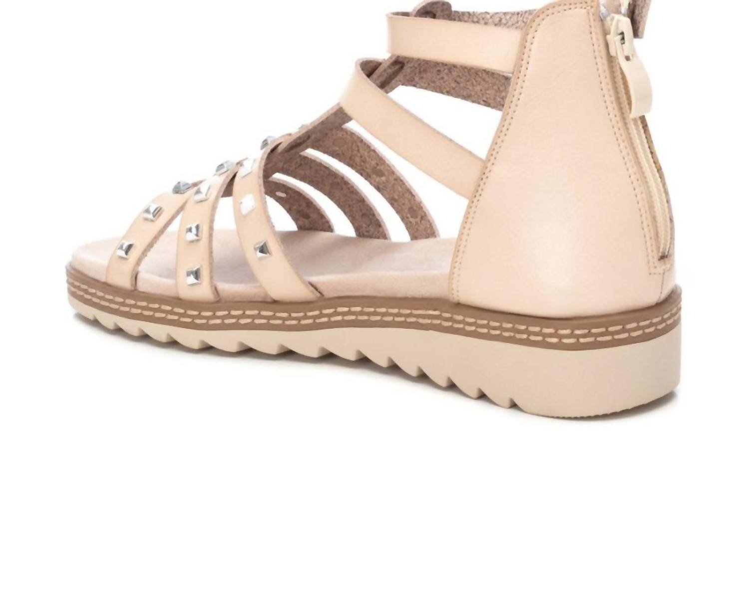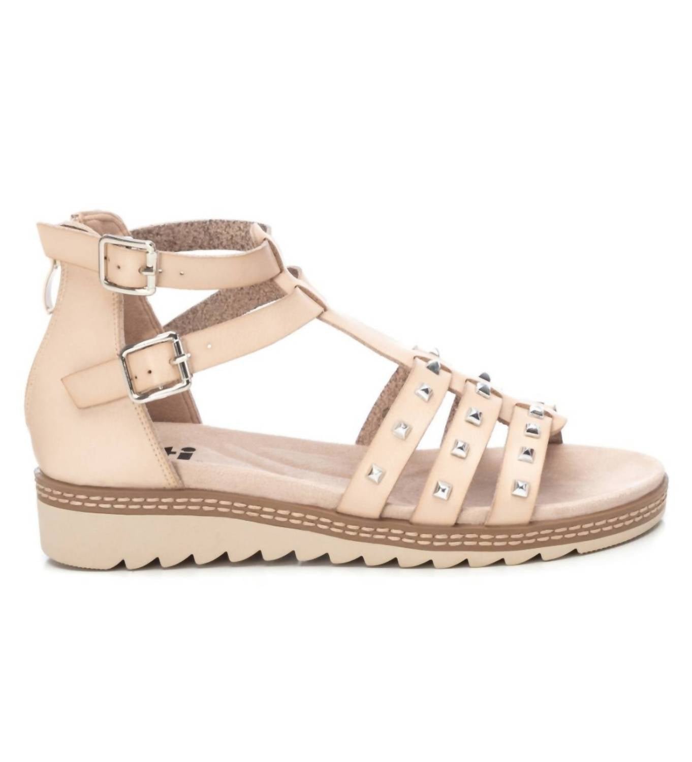 Classicly cute and all-day-wearable. We love this sandal.These sandals mimic the texture of genuine leather. Intricate strip design, accentuated by gleaming gold studs. Featuring a convenient back zipper closure along with adjustable side metal buckles, these sandals promise a secure and customizable fit. The durable non-slip rubber sole ensures an unwavering grip on any surface.